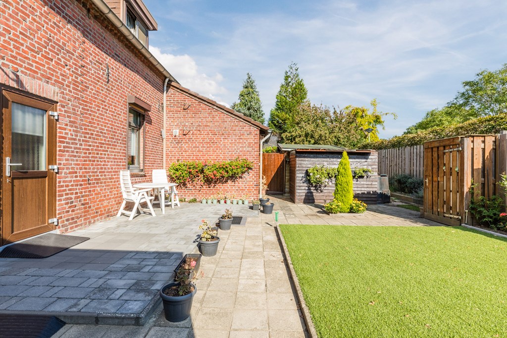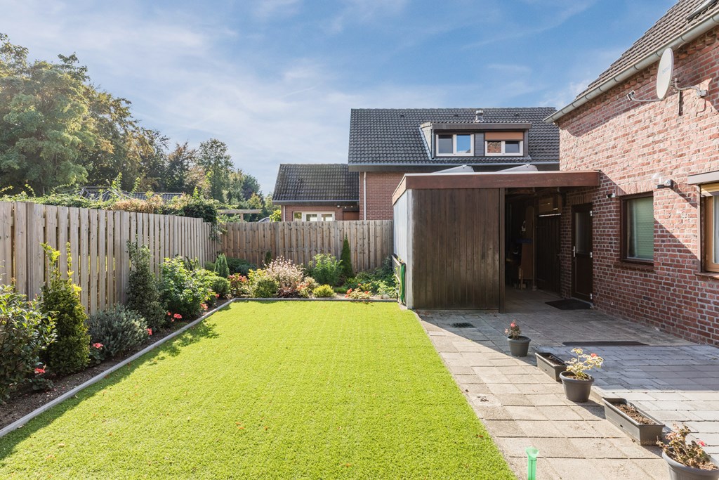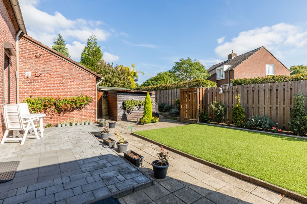 De achtertuin combineert groen en onderhoudsvriendelijkheid en biedt ruimte voor zowel zon als schaduw, een terraszone en een overkapping. Aan de rechterzijde van de woning bevindt zich een ruime carport van ca. 19 m² met achterom.