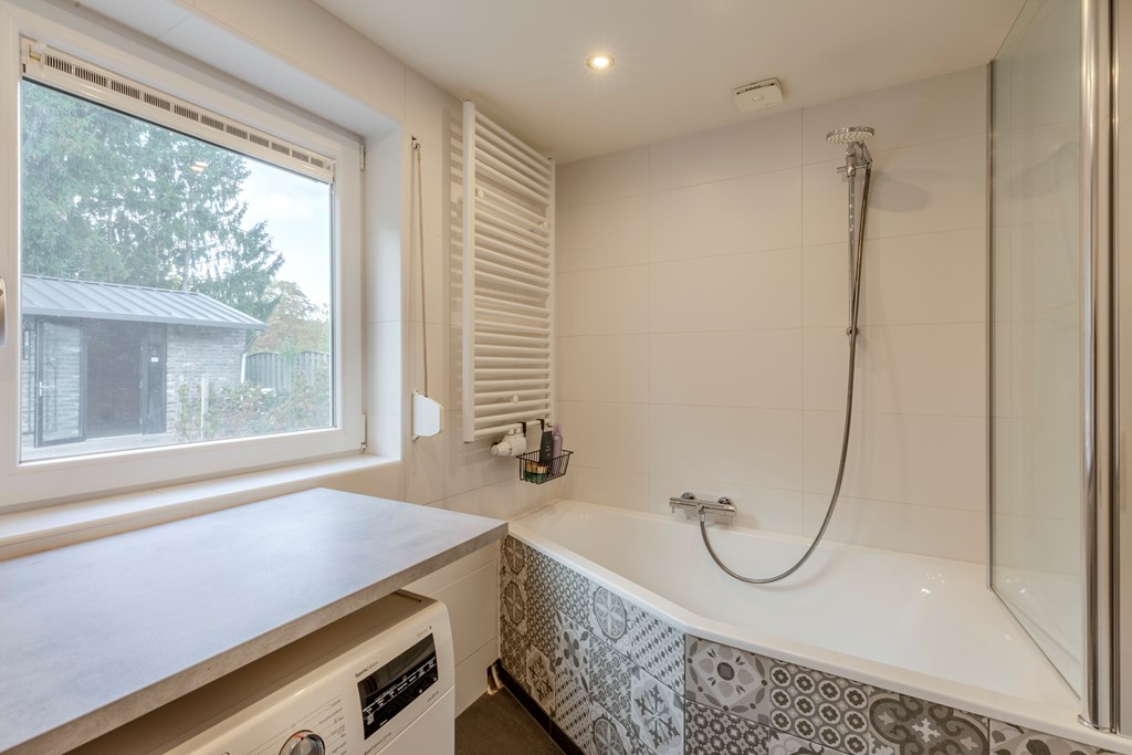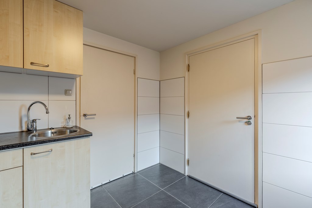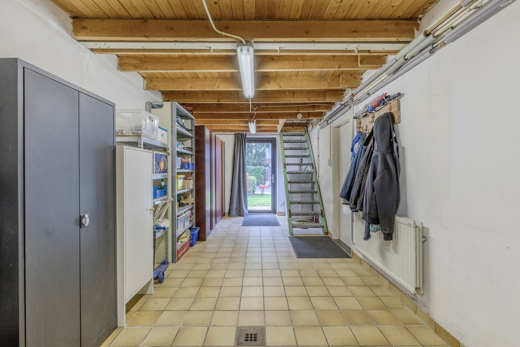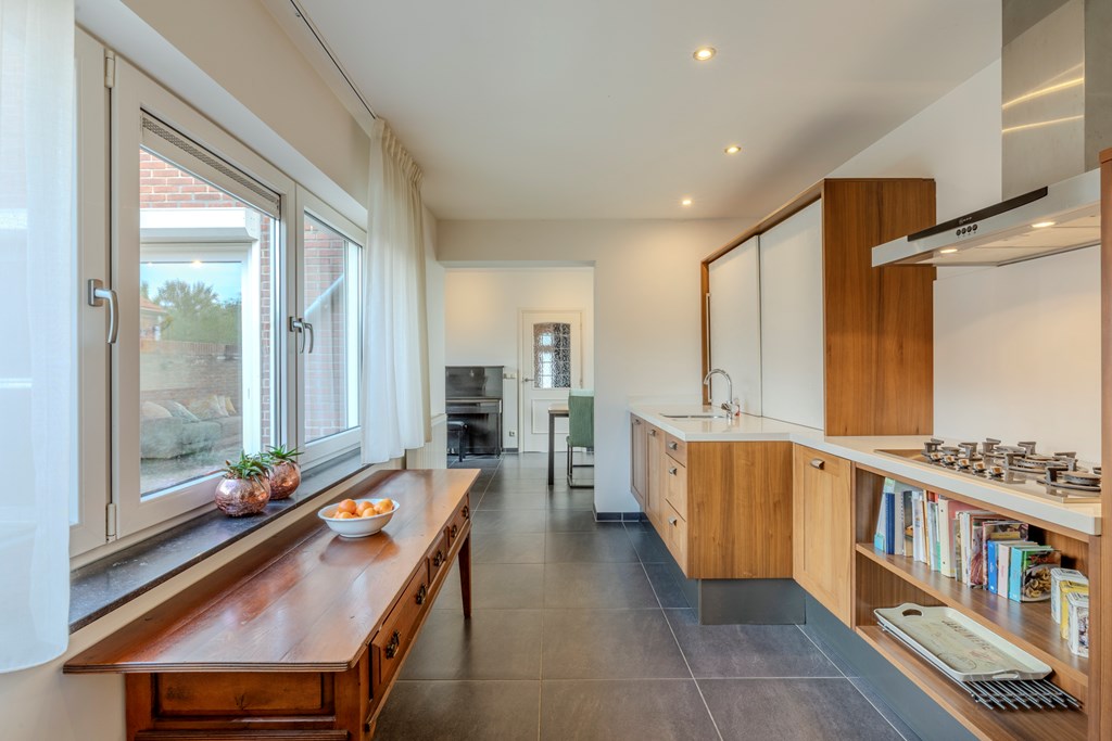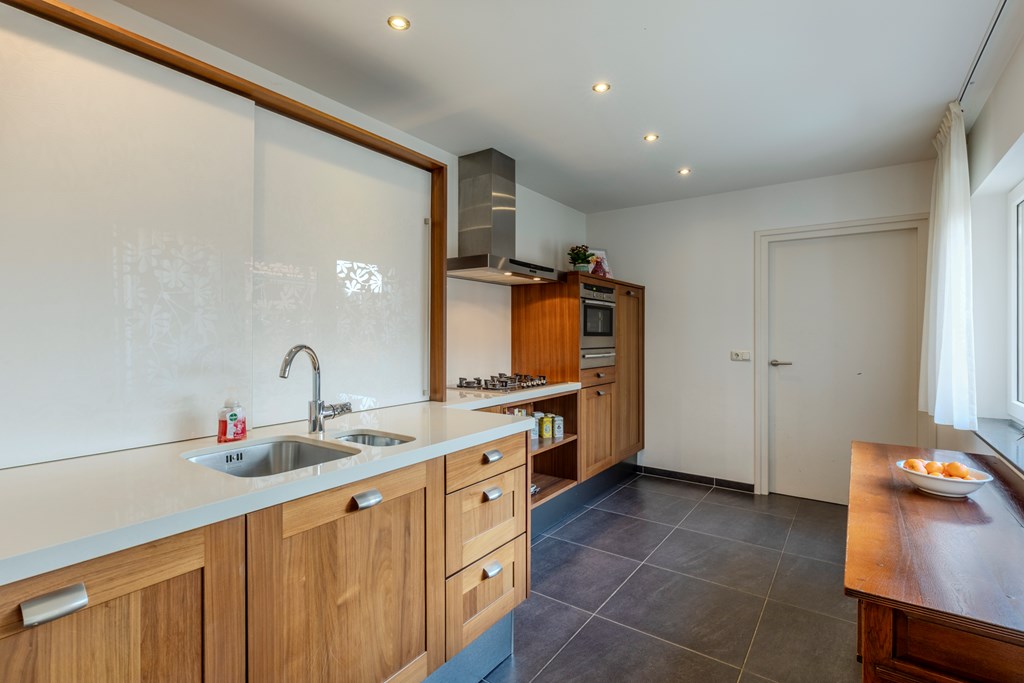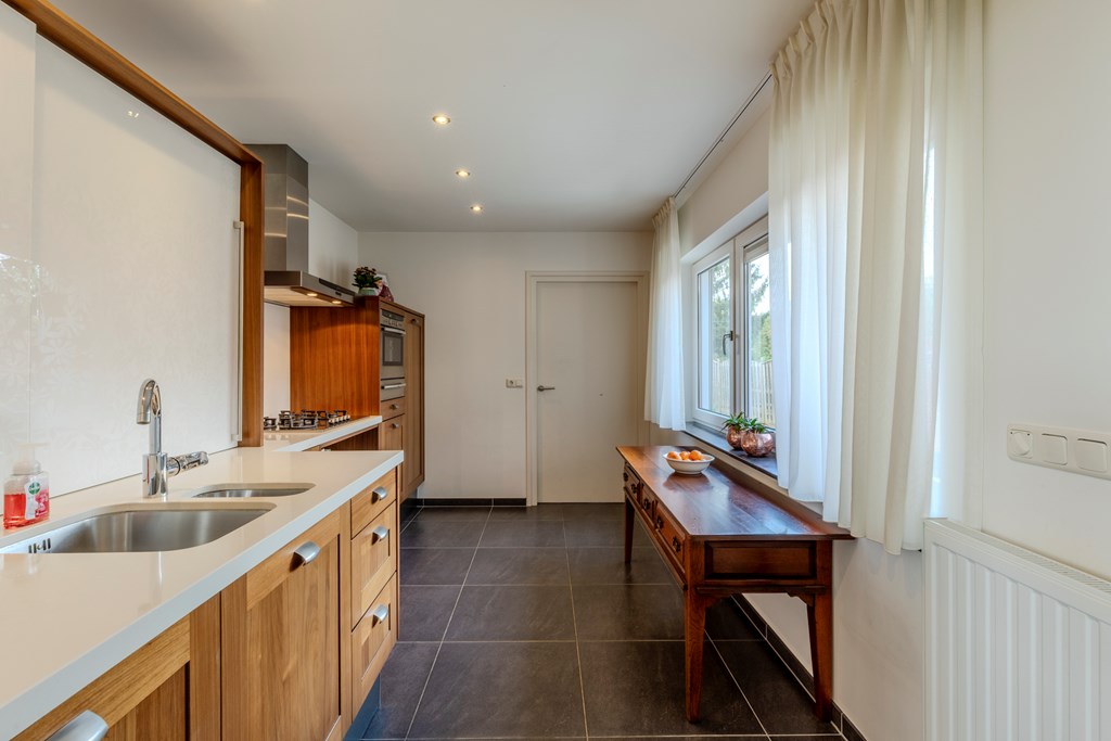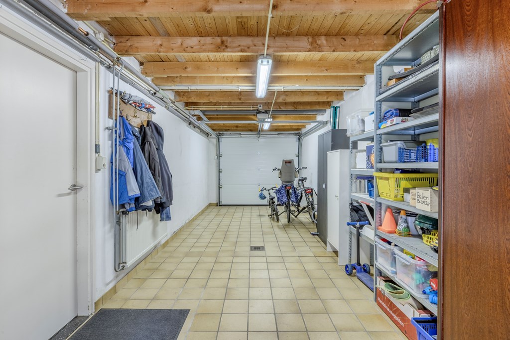 Ruime hal (10 m²) met moderne tegelvloer, zwevend toilet met fonteintje, woonkamer met tegelvloer en schuifpui naar het terras (32 m²), half open keuken (12 m²) met een keukenopstelling v.v. een 5-pits gaskookplaat, afzuigkap, oven/stoomoven, warmhoud lade en vaatwasser, een bijkeuken (8 m²) en de extra badkamer (3 m²) met ligbad en aansluitingen voor het witgoed. De inpandige garage (26 m²) met toegang tot een zolderberging (12 m²) maakt het geheel af.