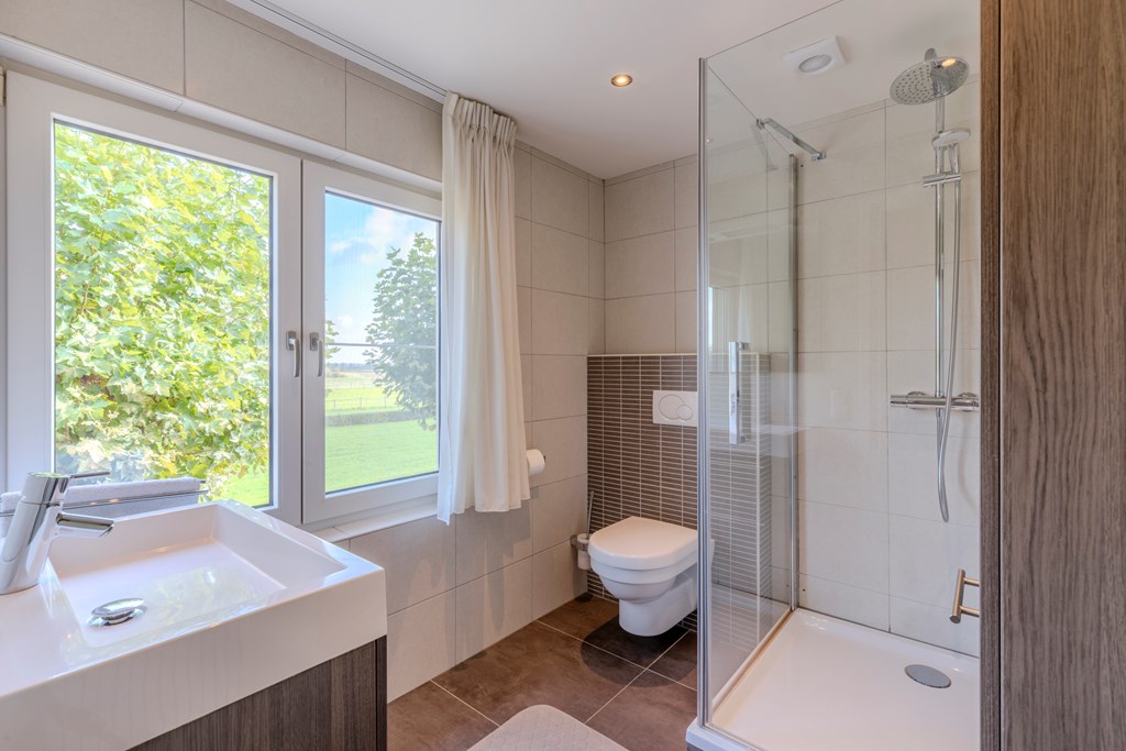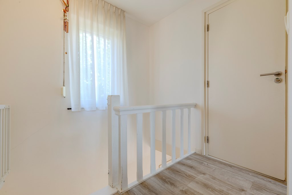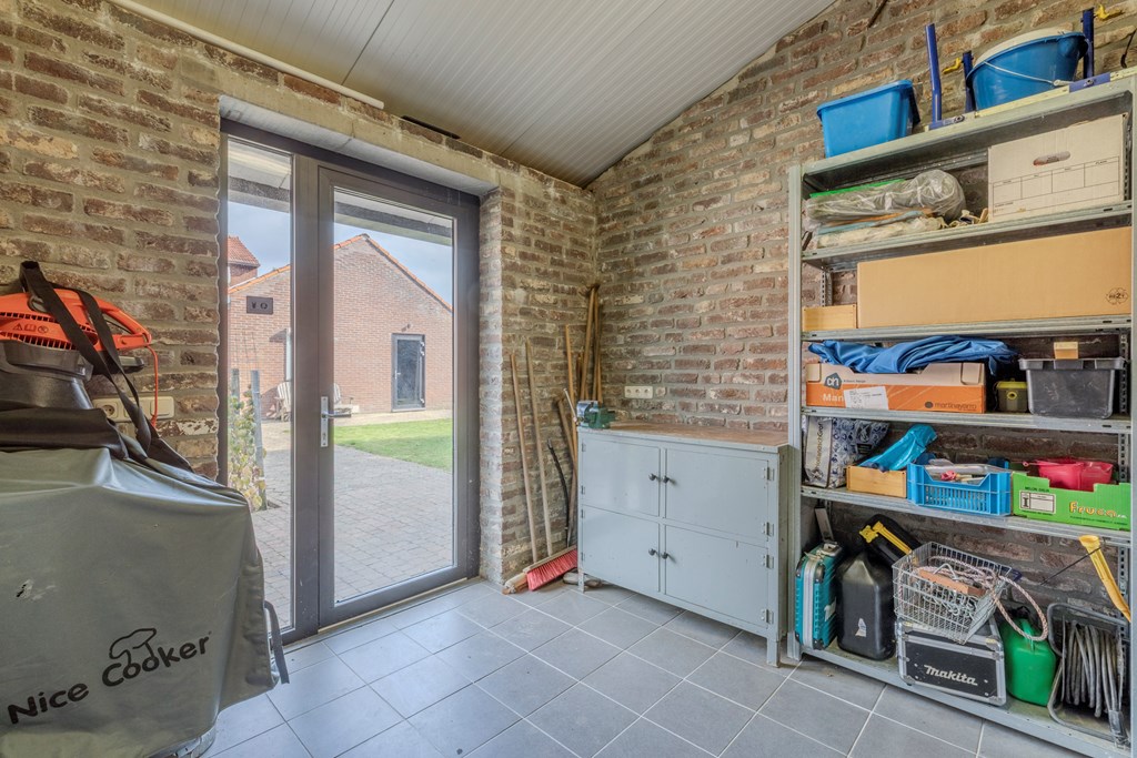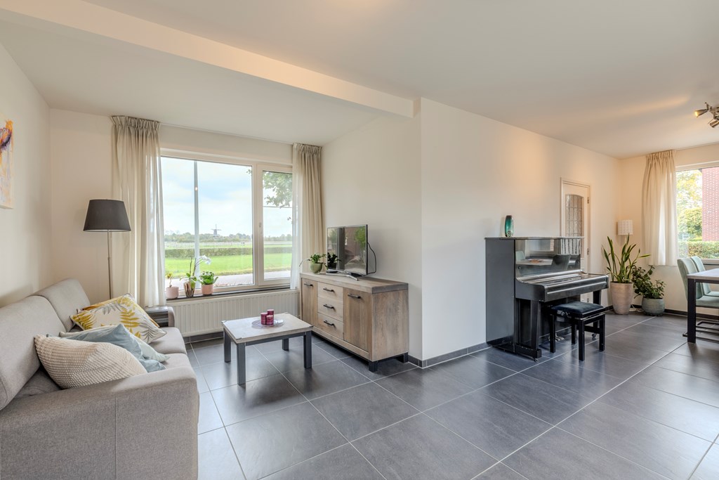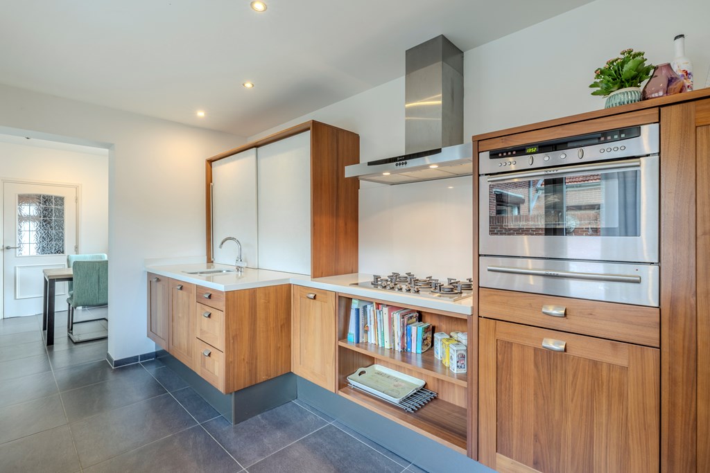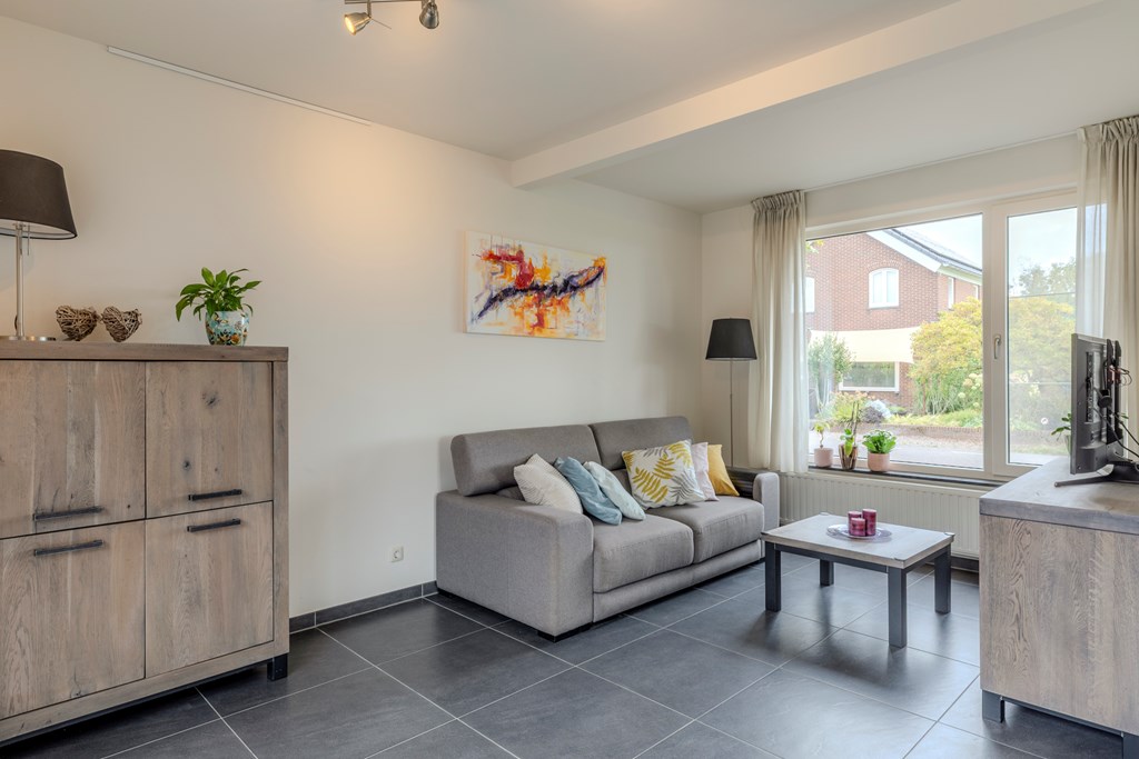 Ruime hal (10 m²) met moderne tegelvloer, zwevend toilet met fonteintje, woonkamer met tegelvloer en schuifpui naar het terras (32 m²), half open keuken (12 m²) met een keukenopstelling v.v. een 5-pits gaskookplaat, afzuigkap, oven/stoomoven, warmhoud lade en vaatwasser, een bijkeuken (8 m²) en de extra badkamer (3 m²) met ligbad en aansluitingen voor het witgoed. De inpandige garage (26 m²) met toegang tot een zolderberging (12 m²) maakt het geheel af.