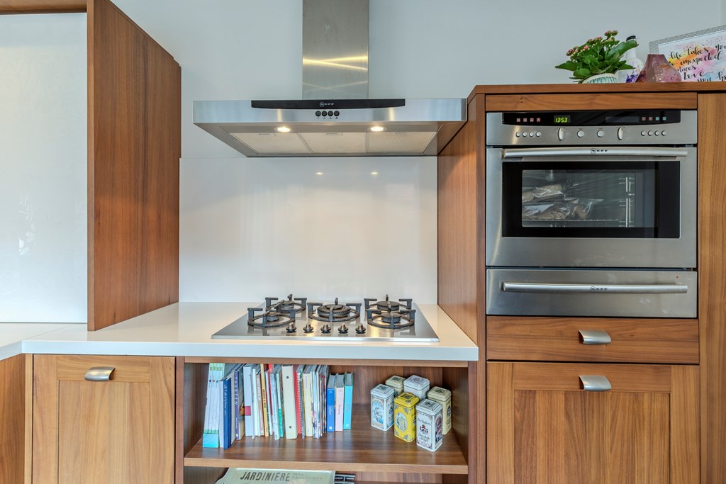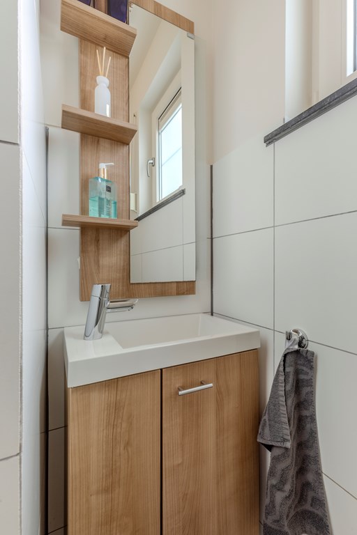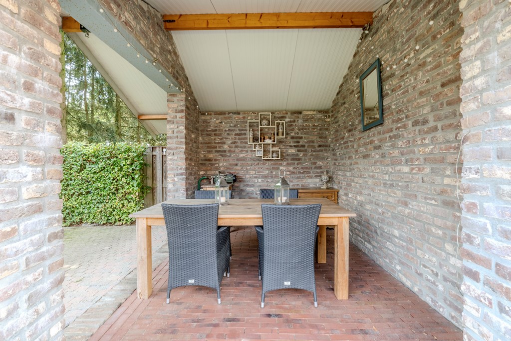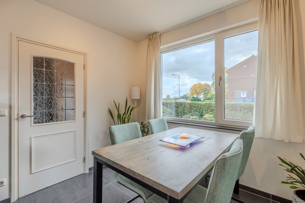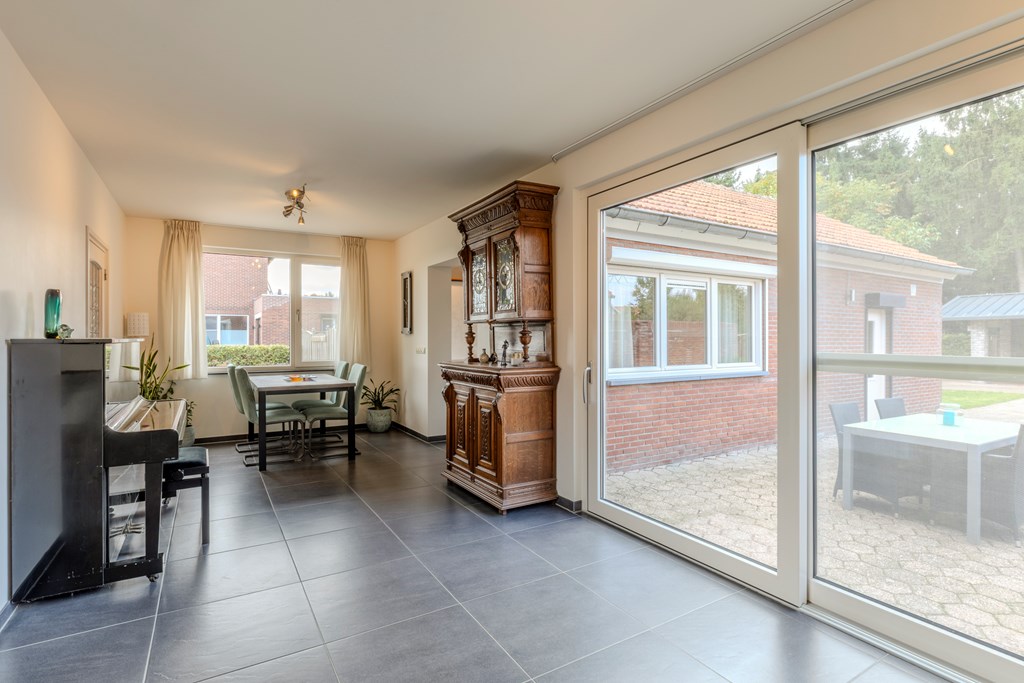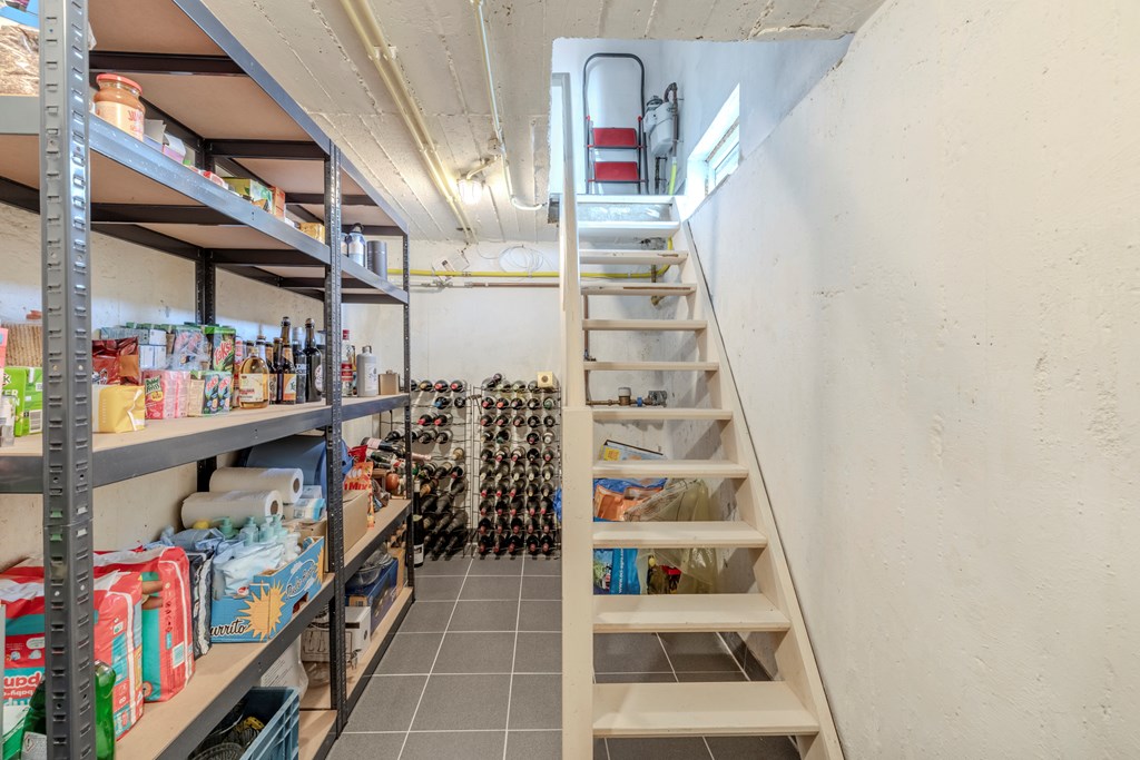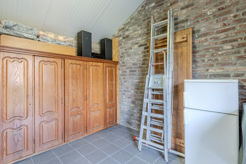 Ruime hal (10 m²) met moderne tegelvloer, zwevend toilet met fonteintje, woonkamer met tegelvloer en schuifpui naar het terras (32 m²), half open keuken (12 m²) met een keukenopstelling v.v. een 5-pits gaskookplaat, afzuigkap, oven/stoomoven, warmhoud lade en vaatwasser, een bijkeuken (8 m²) en de extra badkamer (3 m²) met ligbad en aansluitingen voor het witgoed. De inpandige garage (26 m²) met toegang tot een zolderberging (12 m²) maakt het geheel af.
