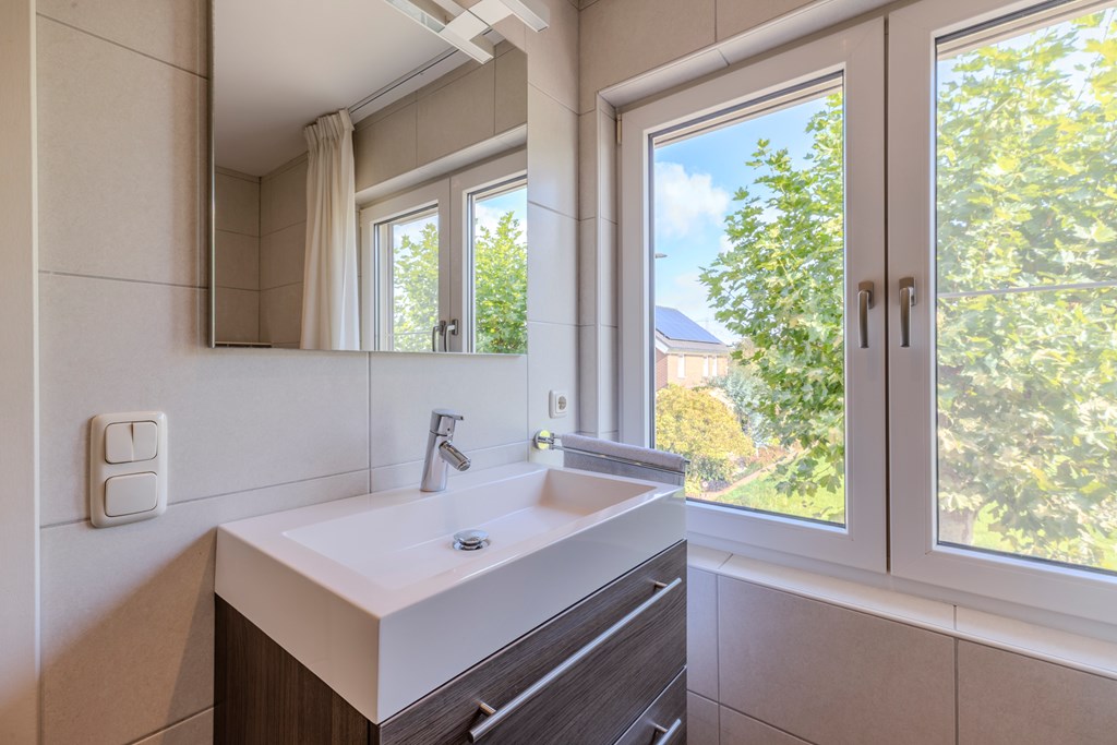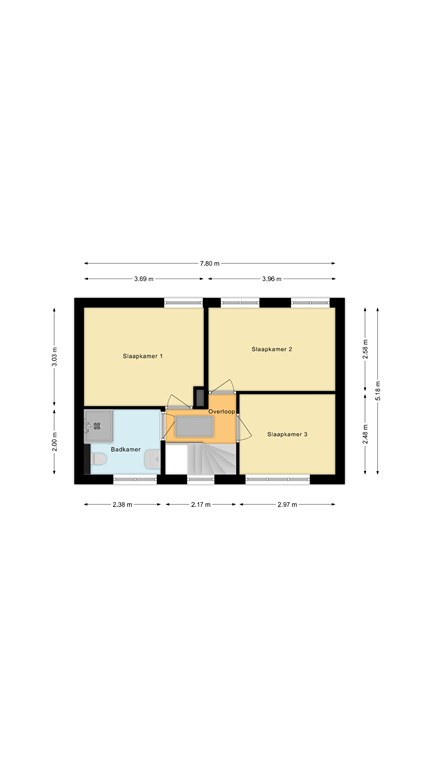 Overloop, 3 slaapkamers (11 m², 10 m², 7 m² ), badkamer met douche, toilet en wastafel in inbouwmeubel.